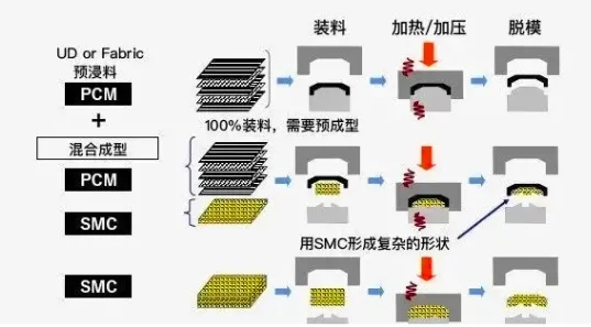 即CFRTP连续碳纤维被完全浸渍进 PEEK 树脂,形成高强度 单向带 / 织物带,再用于热压成型。