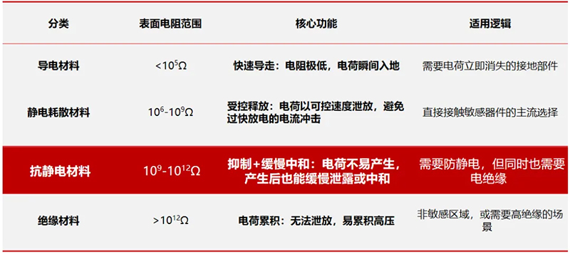 防静电材料的核心指标是表面电阻率(单位:Ω)。它不是"越低越好",而是"匹配场景才好"。我们可以把这四种材料理解为车间里的四种"角色":